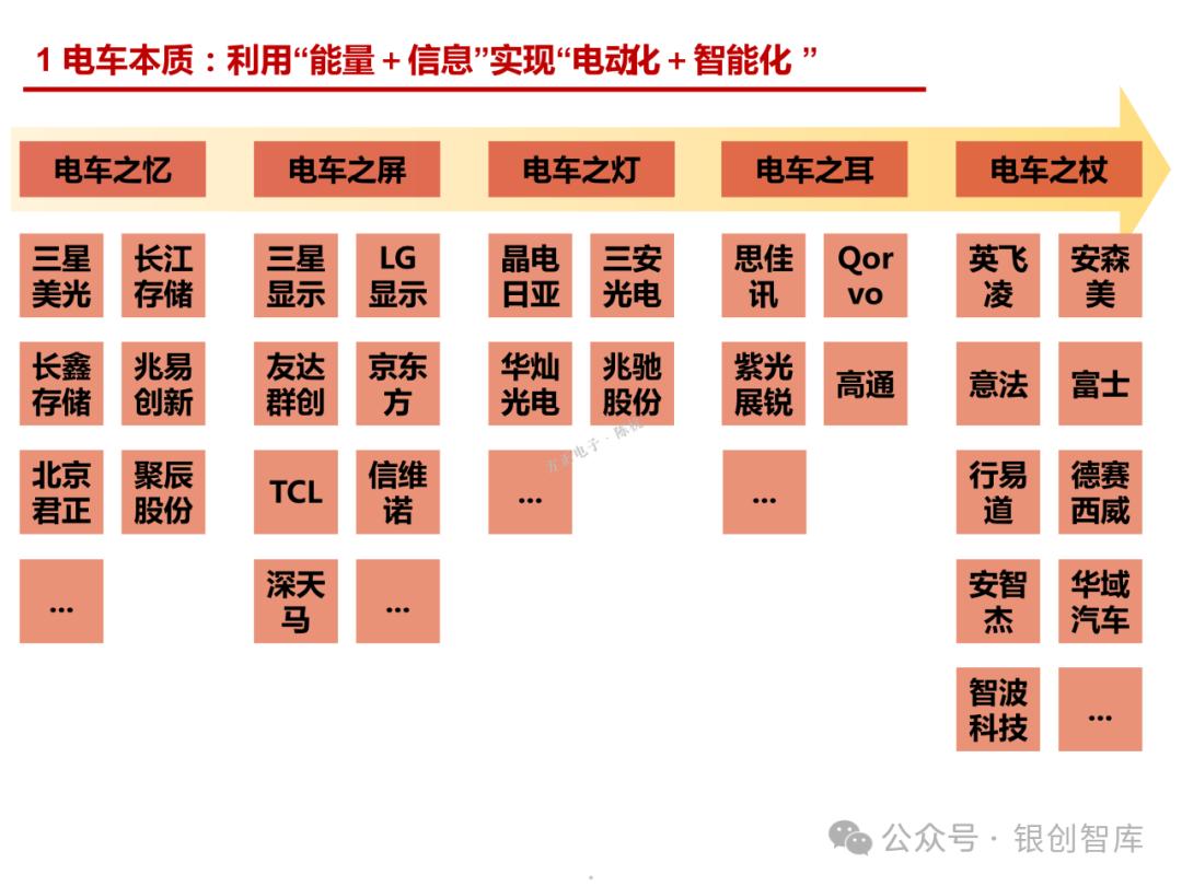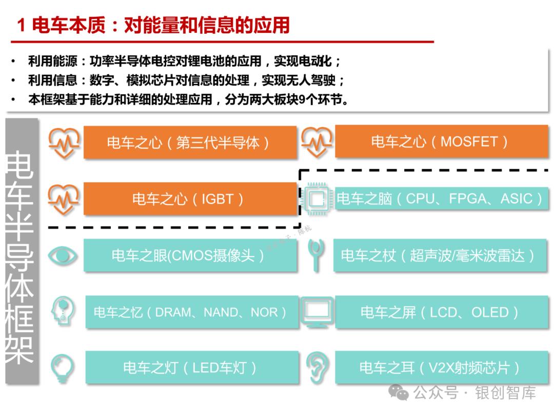 新能源汽车的崛起正驱动汽车产业迎来 “电动化 + 智能化” 的深度变革,而半导体作为核心支撑,成为这场变革的关键引擎。电车的本质在于对 “能量” 与 “信息” 的高效融合 —— 通过功率半导体实现能量的转换与传输,支撑电动化落地;借助计算、传感、存储等芯片完成信息的感知、处理与交互,推动智能化升级。从 “电车之脑” 的异构计算芯片到 “电车之心” 的功率半导体,从 “电车之眼” 的车载摄像头到 “电车之忆” 的存储芯片,半导体贯穿新能源汽车 9 大核心环节,构建起覆盖设计、制造、封测的完整产业链。