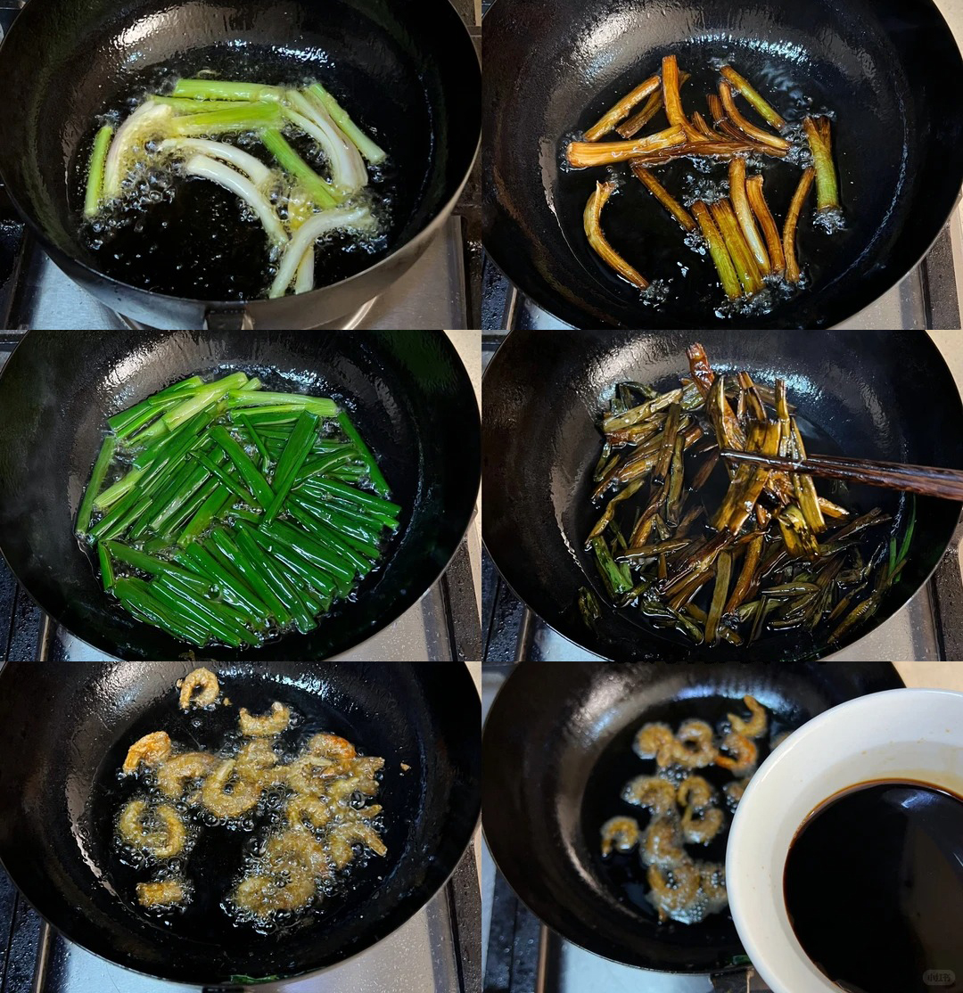 1️⃣小葱洗净擦干水分切段备用,油热先放葱白炸,炸变色后捞出,再放葱叶,炸变色后捞出,放虾仁炒香下,关火;