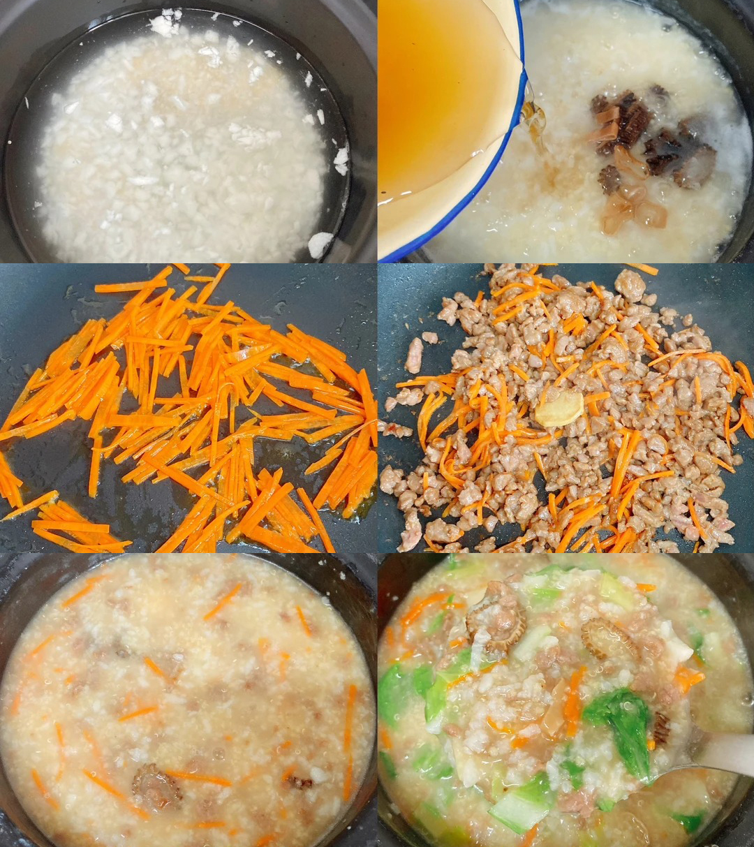 3️⃣锅中倒油、下胡萝卜炒香,下牛肉快速滑散、翻炒变色,倒入煮好的粥中搅拌均匀;再加入青菜碎、加适量盐调味即可。