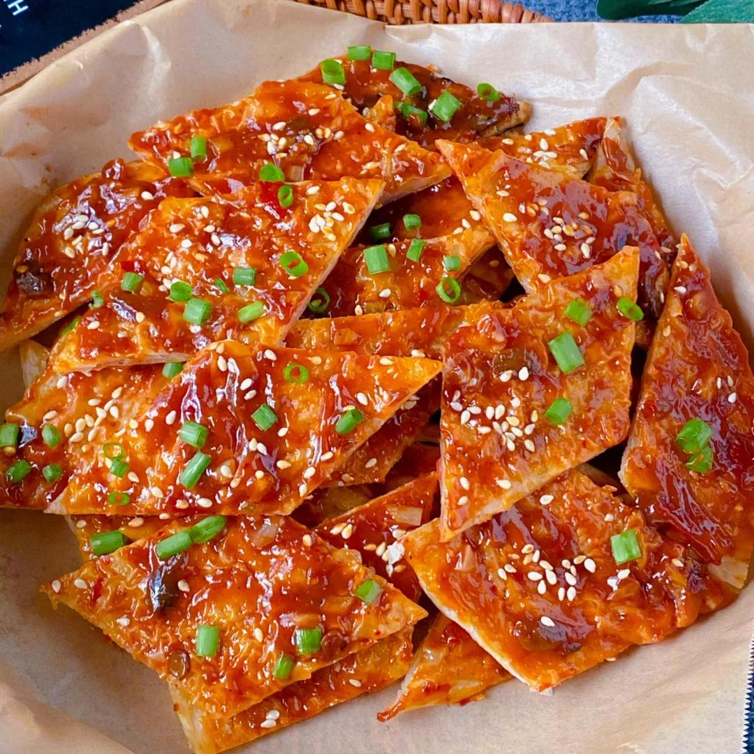 2️⃣手抓饼煎至两面金黄,刷上酱料,撒香葱和白芝麻,切成小块即可。