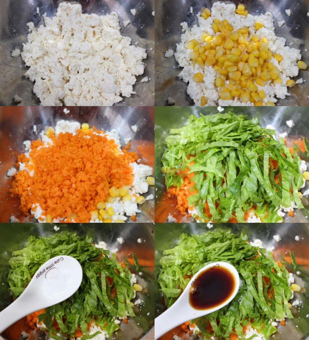 1️⃣ 一块烤豆腐捏碎,加玉米粒、胡萝卜碎、生菜丝、少许盐、一勺生抽、黑胡椒、两个鸡蛋、三勺面粉搅拌均匀;