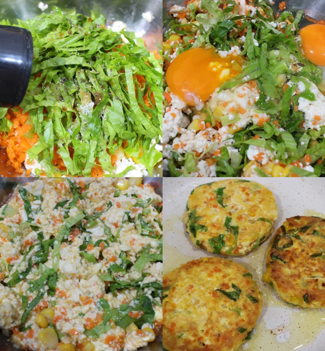 ✅ 亮点:这个豆腐鸡蛋饼,营养和口感都在线!老豆腐压碎,搭配玉米、胡萝卜、生菜、鸡蛋和少许面粉,植物蛋白与膳食纤维协同,低脂又饱腹。两面煎到微焦,外层酥脆掉渣,内里软嫩湿润,蔬菜粒带来自然清甜,越嚼越香,轻松拿捏健康一餐。
