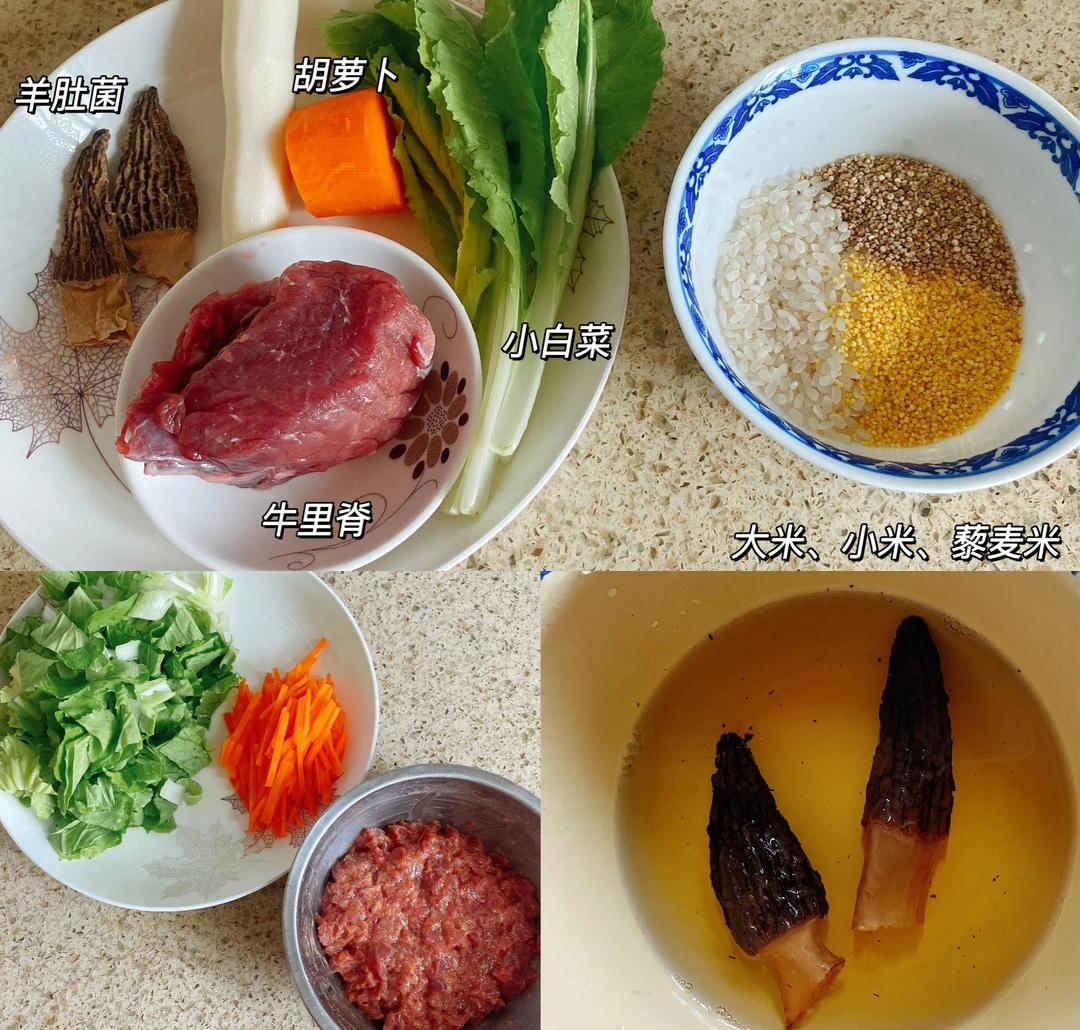 1️⃣青菜切碎、胡萝卜切丝,牛肉切丁加姜片、酱油、淀粉、油抓匀腌制15分钟;羊肚菌洗净泡发备用;