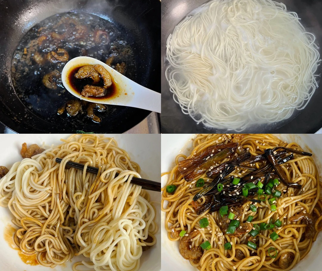 3️⃣水开下面条,煮熟捞出,再倒入煮好的葱油,放适量葱花、芝麻拌匀即可;