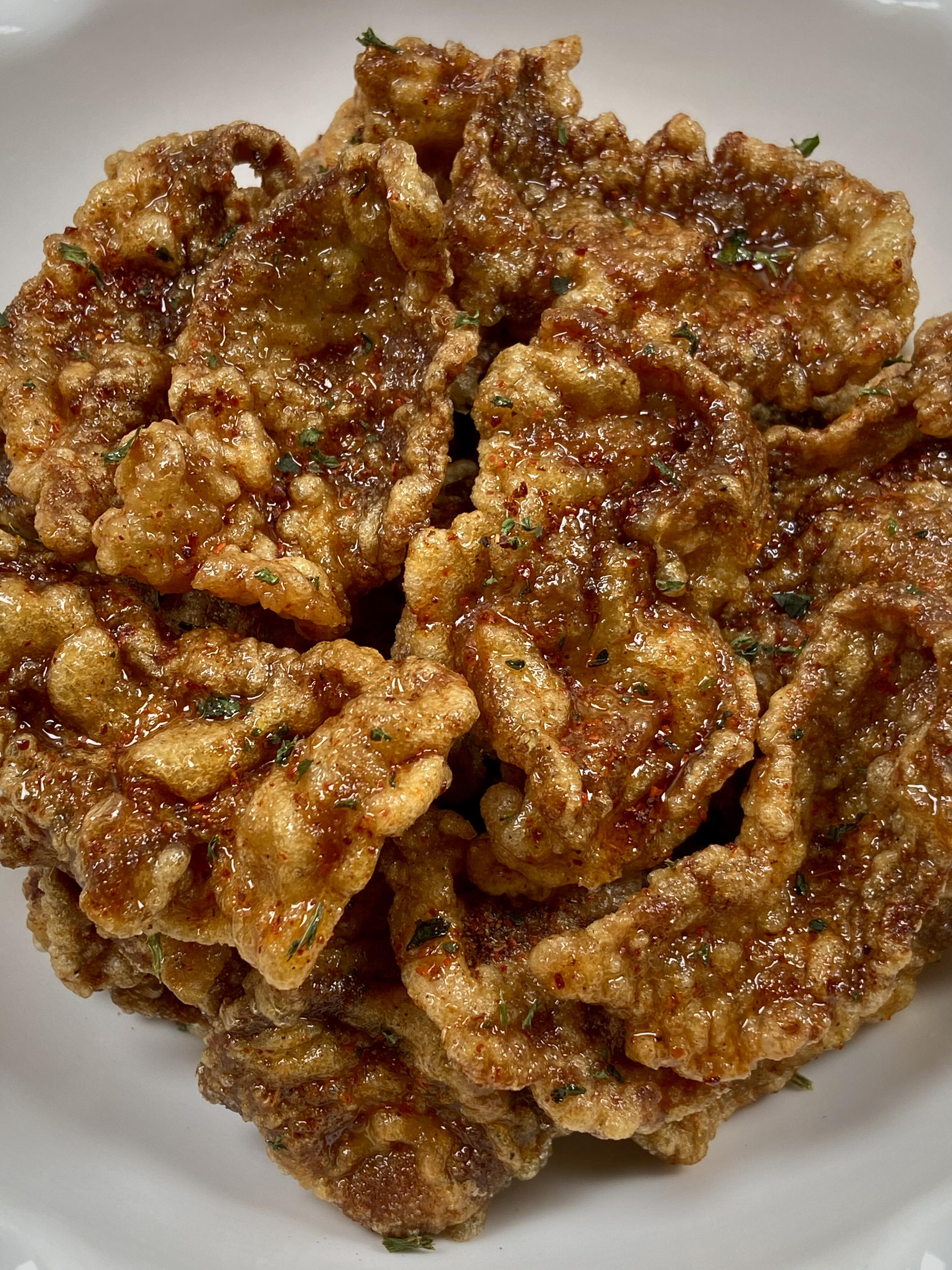 等锅里的油温再次升高,烧到七八成热,就要进行第二次复炸了。把刚才炸过的肉片一股脑儿全倒回锅里,快速翻炸个二三十秒。你会看到肉片的颜色迅速变成漂亮的金黄色,外皮也变得硬挺酥脆。这时候就得眼疾手快,赶紧捞出来,多一秒都可能炸过头。沥干油分后,趁热撒上灵魂所在的椒盐粉和一点点辣椒面,再颠几下盆,让每一片肉都均匀地裹上这层咸香微辣的“外衣”。