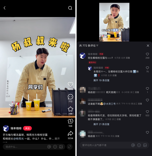 当下,“传播主导权”由品牌发布,迁移到转发人的手里。瑞幸不仅深谙“挖梗”(产品创意与IP热梗的契合)与“造梗”(深入话题二次传播),还能在线“接梗”,随时响应多级热点,不让网友的梗、包袱掉地上。例如网友质疑“只有技能 没有五子棋”,品牌迅速安排@杨雨光 代言生椰杨枝甘露,让“父与子 杨雨光”的剧情延续。