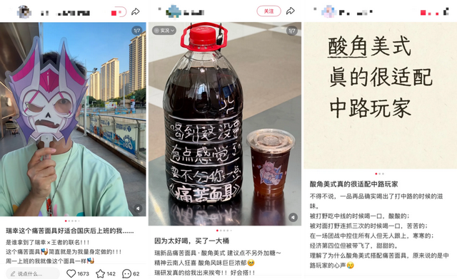 这里的“多”,既有联名的频次、数量多,瑞幸一个月就跑完别家一个季度,甚至一年的热度指标;也有兴趣圈层的覆盖度广——在时尚、文化、体育、游戏等多领域,全面开花。此外,瑞幸在圈层传播里,也在植入破圈的、基于大众兴趣点的爆梗,例如在王者联名的“痛苦面具”中,响应大众长假返工的“大情绪”;
