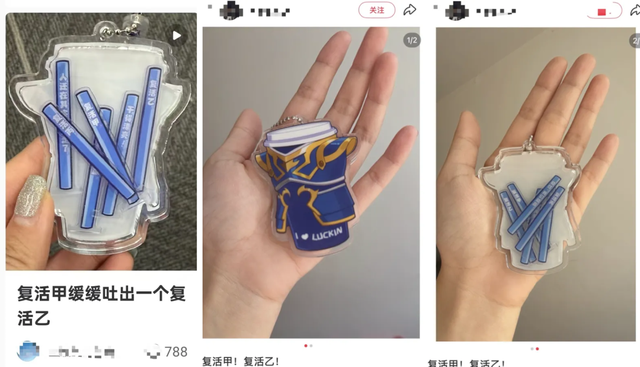 不仅数量上6,瑞幸还玩起道具战——“痛苦面具酸角美式”匹配上返工的生无可恋脸,“马斯卡彭复活甲”强势上演熹妃回宫。配合着联名周边的抽象艺术,瑞幸激起一波又一波迷因化传播。反正淡人感消失,整个人都变浓了。
