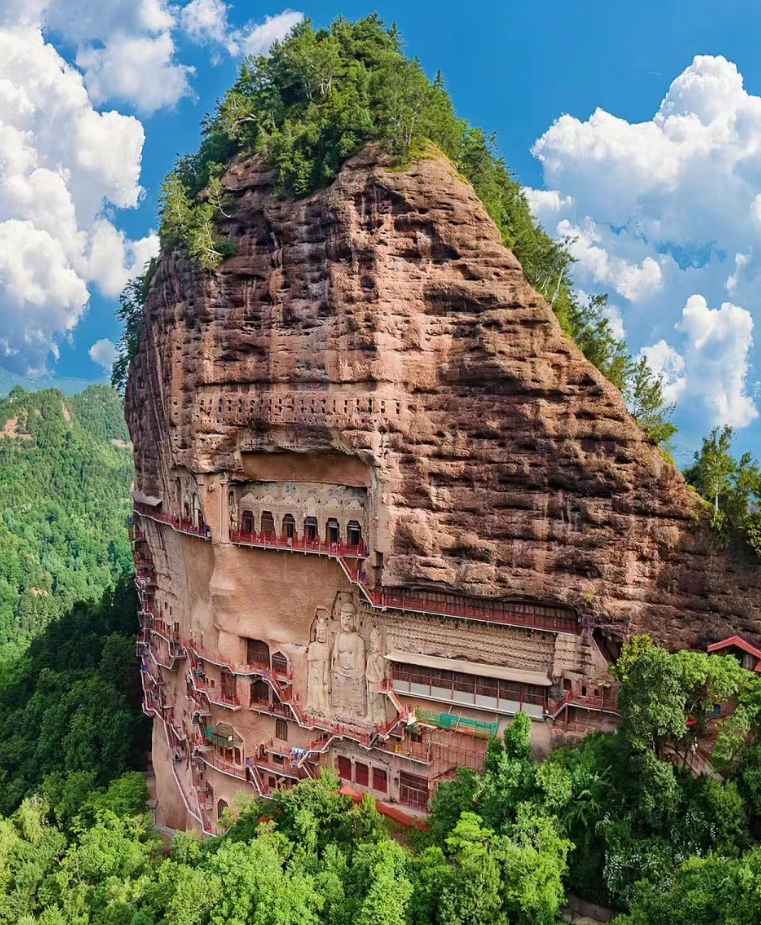 如果说敦煌展现了宗教艺术的多彩与丰富,那么麦积山石窟则以精致的雕刻与超凡脱俗的神韵令人动容。麦积山位于甘肃天水,因山形酷似堆积的麦垛而得名。石窟依山而建,最高处达70米,仅通过悬空栈道连接。这里保存着10000余身佛像、200多个洞窟,记录了中国古代工匠的智慧与创造力。无论是佛像的神情、衣褶,还是壁画的色彩,都体现了深厚的文化内涵。站在麦积山下,仰望这些石雕艺术品,人们会不由得赞叹古人对信仰的虔诚和艺术的追求。