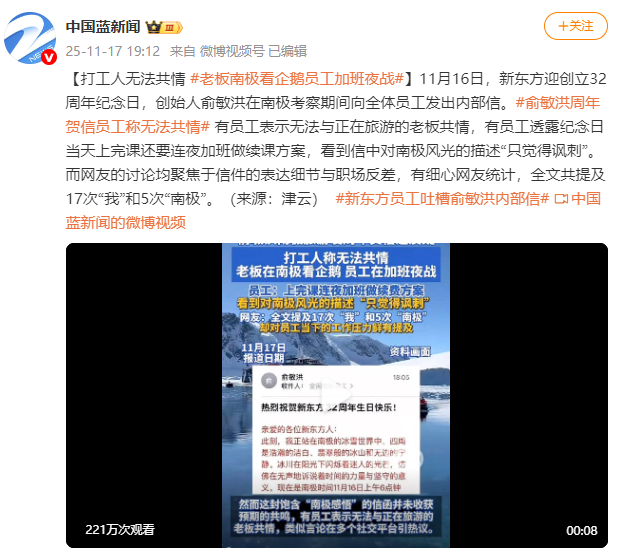 18日一早,“新东方员工吐槽俞敏洪内部信”等话题词登上热搜。11月16日,新东方迎创立32周年纪念日,创始人俞敏洪在南极考察期间向全体员工发出内部信。有员工表示无法与正在旅游的老板共情,也有员工透露纪念日当天上完课还要连夜加班做续课方案。