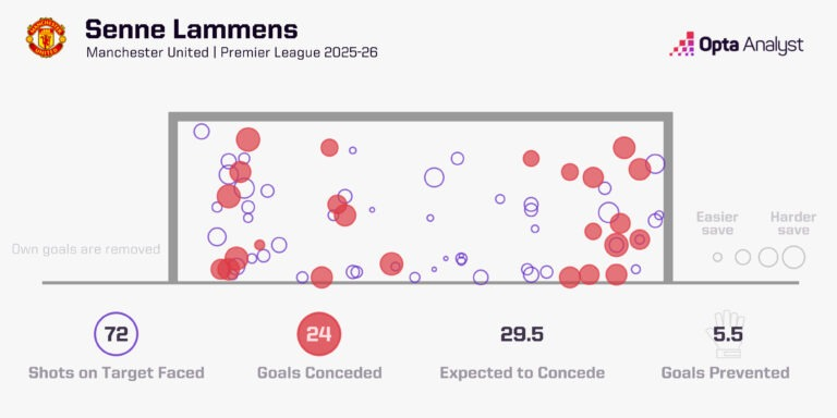 根据Opta的“射正预期进球值(xGOT)”模型,自去年10月4日完成曼联首秀以来,他的扑救表现比“平均门将”多防住了5.5个进球。