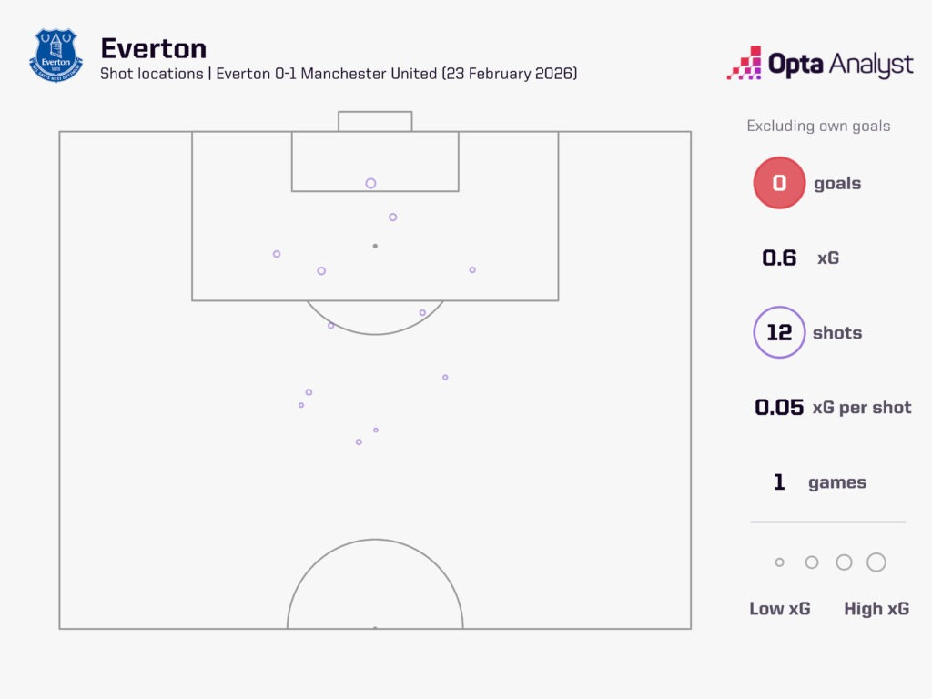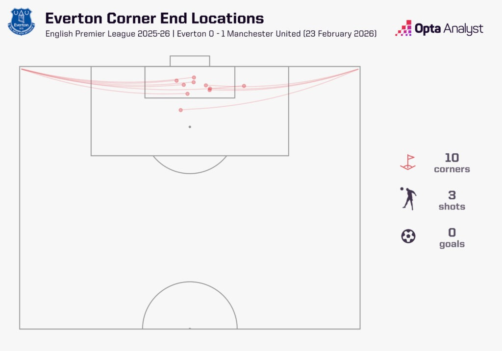 下半场,埃弗顿获得了9次角球——本赛季英超只有三支球队在单场半场角球数上超过这个数字。全场他们一共获得10次角球,但仅有1次是在第一次触球后形成射门。