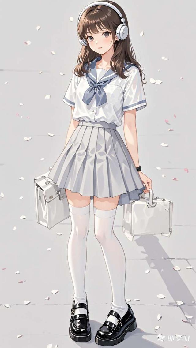 女孩手绘插画,速写,JK装,女孩一个人,穿着白色丝袜,短裙,百褶裙,脚上黑色小皮鞋,JK鞋,白色过膝袜,戴着耳机,收腰,肖像,浪漫温馨,复古,纯白背景选同款生图模型 2.0,尺寸 3:4,点提交生成。