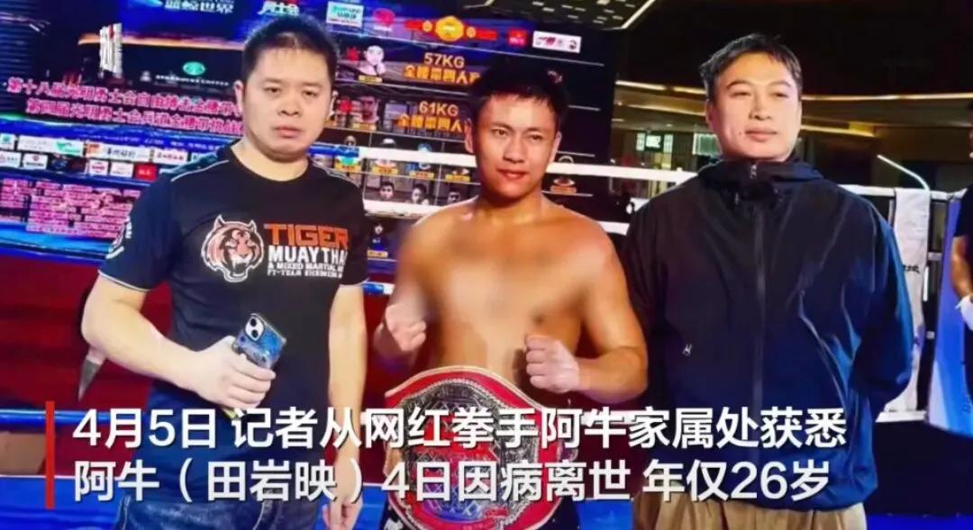据多家媒体报道,4月5日,网红拳手“阿牛”(本名田岩映)因脑颅出血和急性白血病,已于4月4日不幸离世,年仅26岁。