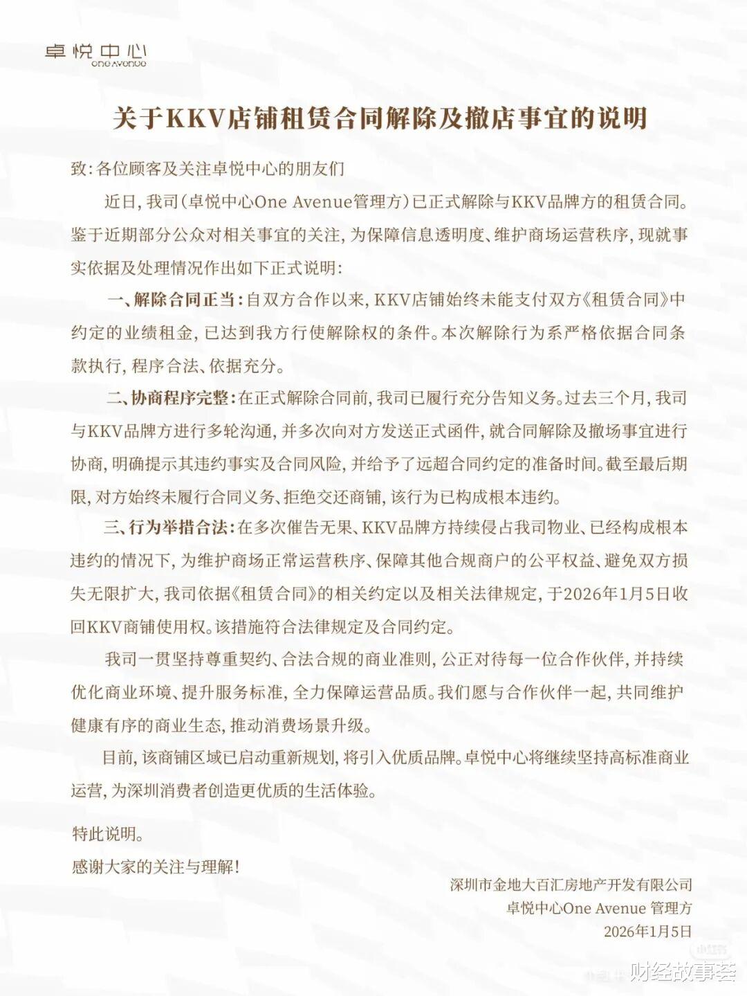 上述声明披露,因业绩不佳导致“实质性违约”,卓悦中心管理方已单方面与KKV解除合同,清退收回店铺。