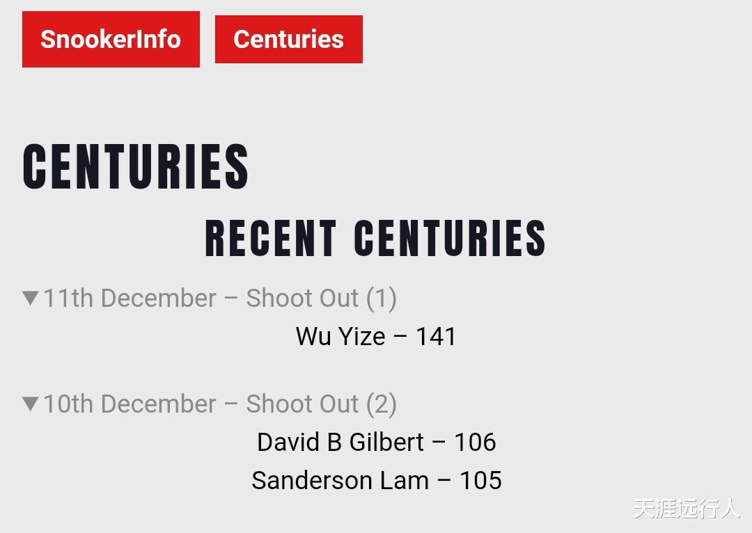 第二比赛日,仅只新科国锦赛冠军吴宜泽打出141分的大号破百,赛会两个比赛日也只产生了三杆单杆破百,吴宜泽的单杆141分,暂列单杆最高分,有望独享5000英镑的单杆最高分奖。