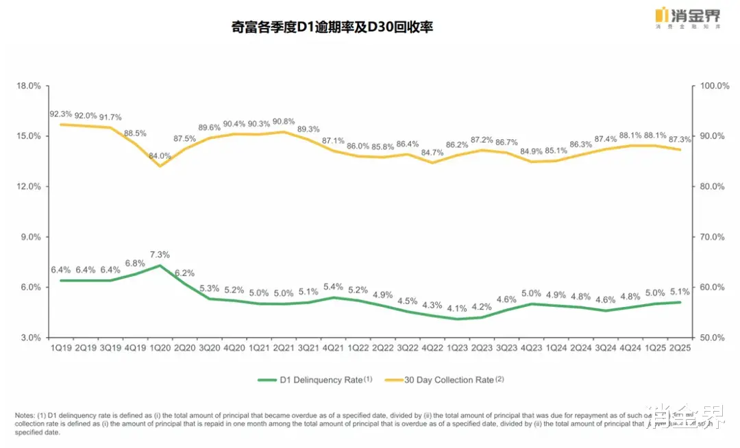 以其披露的评估资产质量前瞻指标的D1逾期率及M1回收率数据来看,二季度,奇富、信也两家的D1逾期率分别为5.1%、4.7%;环比均增幅0.1%;D30回收率分别为87.3%、89%,环比分别下降0.8%及持平。