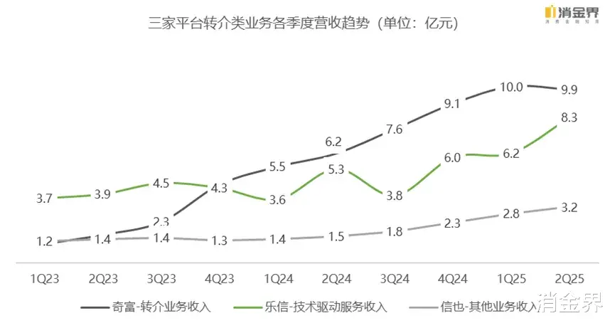 伴随着营收规模的一路走高,转介业务在总营收中的占比也是逐渐加大。以奇富为例,ICE转介业务在2023Q1营收规模,占其总营收比重3.0%,占其平台业务营收比重11.2%,截止到最新观察季度(2025Q2),转介业务营收规模来到了9.9亿元,占总营收比重提升至18.9%,占平台业务营比重提升至59.8%;其他两家该业务规模及比重提升幅度也是不遑多让,乐信同期技术驱动服务营收从1.2亿元增至8.3亿元,占总营收比重从12.3%提升至23.1%;信也同期其他业务营收从1.2亿元增至3.2亿元,占总营收比重从3.0%提升至8.9%。