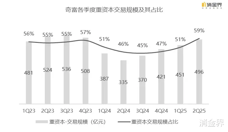 风险抬头的趋势驱动了助贷机构对其资产结构进行调整,首先影响的是其重资本模式(风险兜底)业务规模重回扩张趋势。因乐信、信也未对其交易规模按照“是否风险兜底模式”区分为重、轻资本两种模式,我们仅以龙头奇富的数据为例作为分析对象。