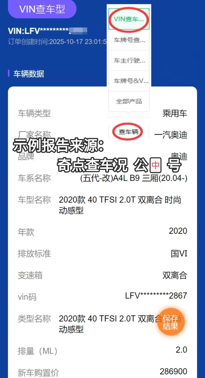 ②按照提示输入相关信息,平台会迅速整合多方数据,生成详细的报告包括:车型、年款、排放标准、变速箱等等。页面会清晰标注 “精准车型”(如2021款2.OL自动两驱GLS领先版),车系名称。(示例报告如下)
