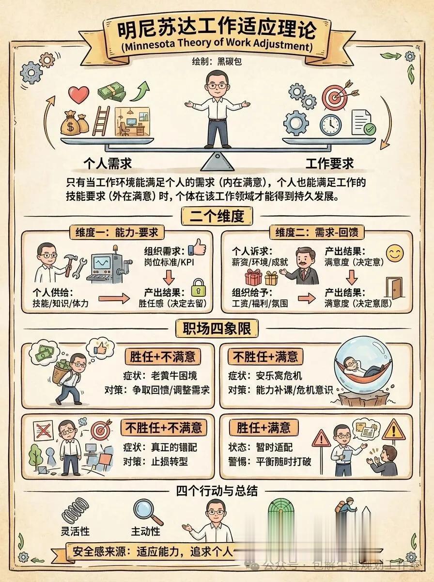 其实,想要跳出这种反复内耗,破解职场“不合适”的困境,我们可以借助一个经典理论——明尼苏达工作适应理论。这套诞生于1964年的经典理论,不仅是高校职业规划教材里的核心内容,更是无数职场人验证过的“脱困指南”,是每个职场人都该掌握的底层逻辑。它最核心的观点,就是打破我们对“完美工作”的幻想:职业发展从来不是静态的“拼图游戏”,而是动态的“平衡艺术”,学会这种平衡,才能真正摆脱职场焦虑,找到属于自己的职场节奏。