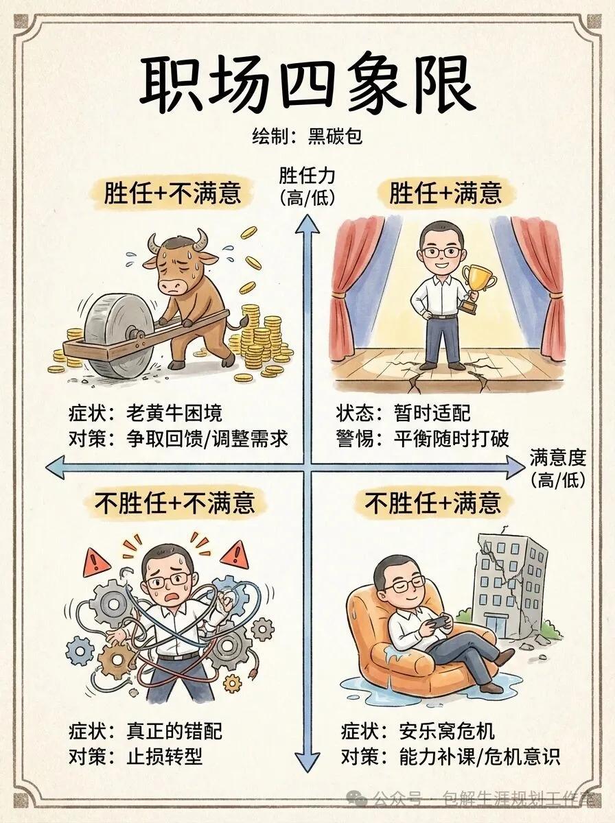 四象限自测:你属于哪种职场状态?看懂了这两个维度,我们就能快速诊断自己的职场状态,找到不快乐的根源。用四象限思维来划分:胜任但不满意,这是典型的老黄牛困境,能力足够支撑工作,却因回馈不足觉得付出与收获不对等,此时最需要的不是提升能力,而是主动争取回馈或合理调整自身需求;满意但不胜任,这是看似幸运的舒适区困境,工作回馈契合需求,却因能力不足难以胜任核心工作,随时面临被淘汰的风险,此时需要的是危机感和针对性的能力补课;既不胜任也不满意,这才是真正的职场不匹配,及时止损或彻底转型才是最优解;而胜任又满意的适配区,虽是理想状态,却也只是暂时的平衡,绝非永恒的答案。