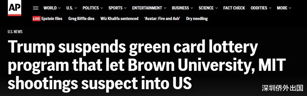 暂停多元化绿卡抽签计划据美联社2025年12月19日报道,美国总统川普下令暂停多元化绿卡抽签计划。该决定是在一起涉及布朗大学和麻省理工学院的枪击案件后作出的。