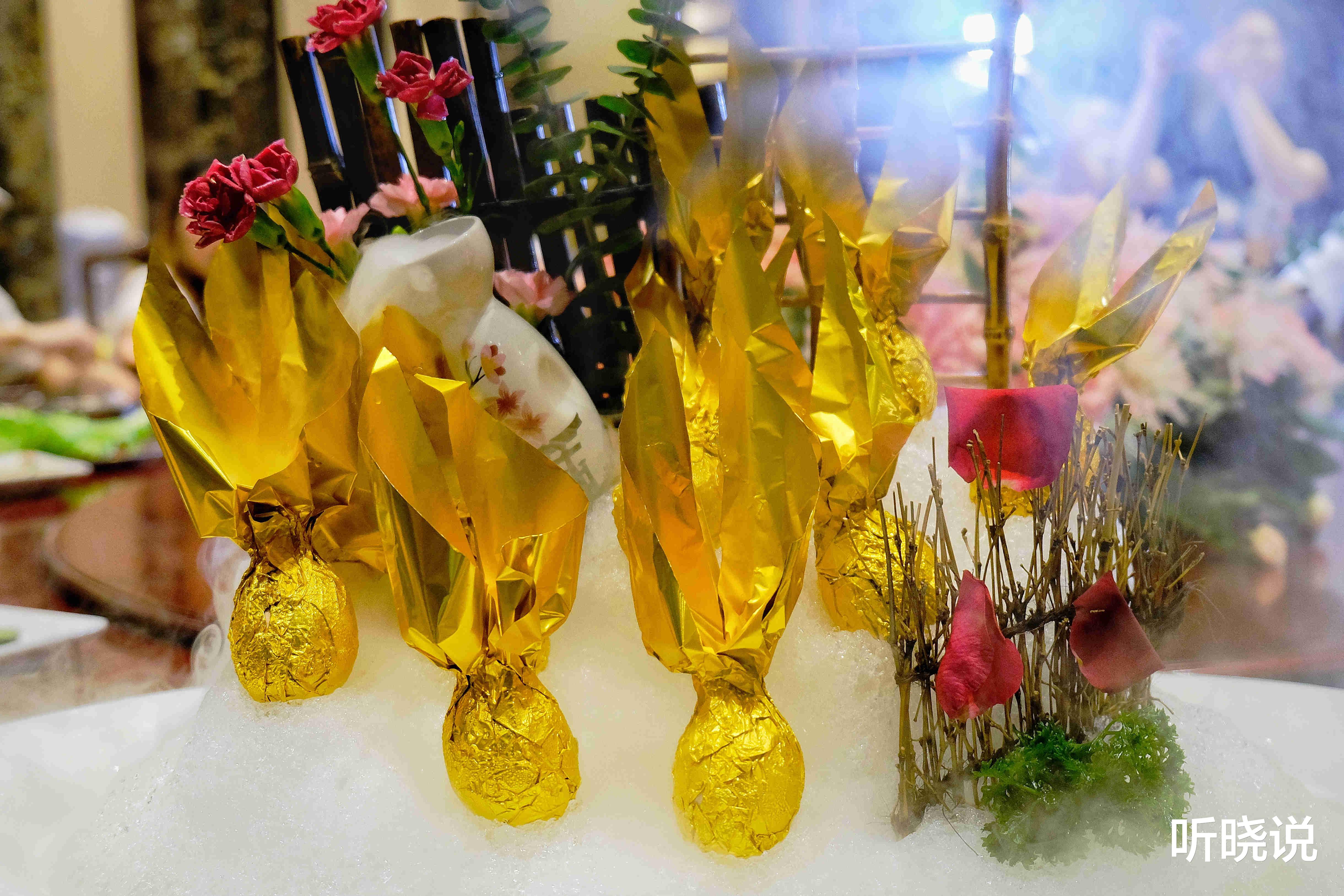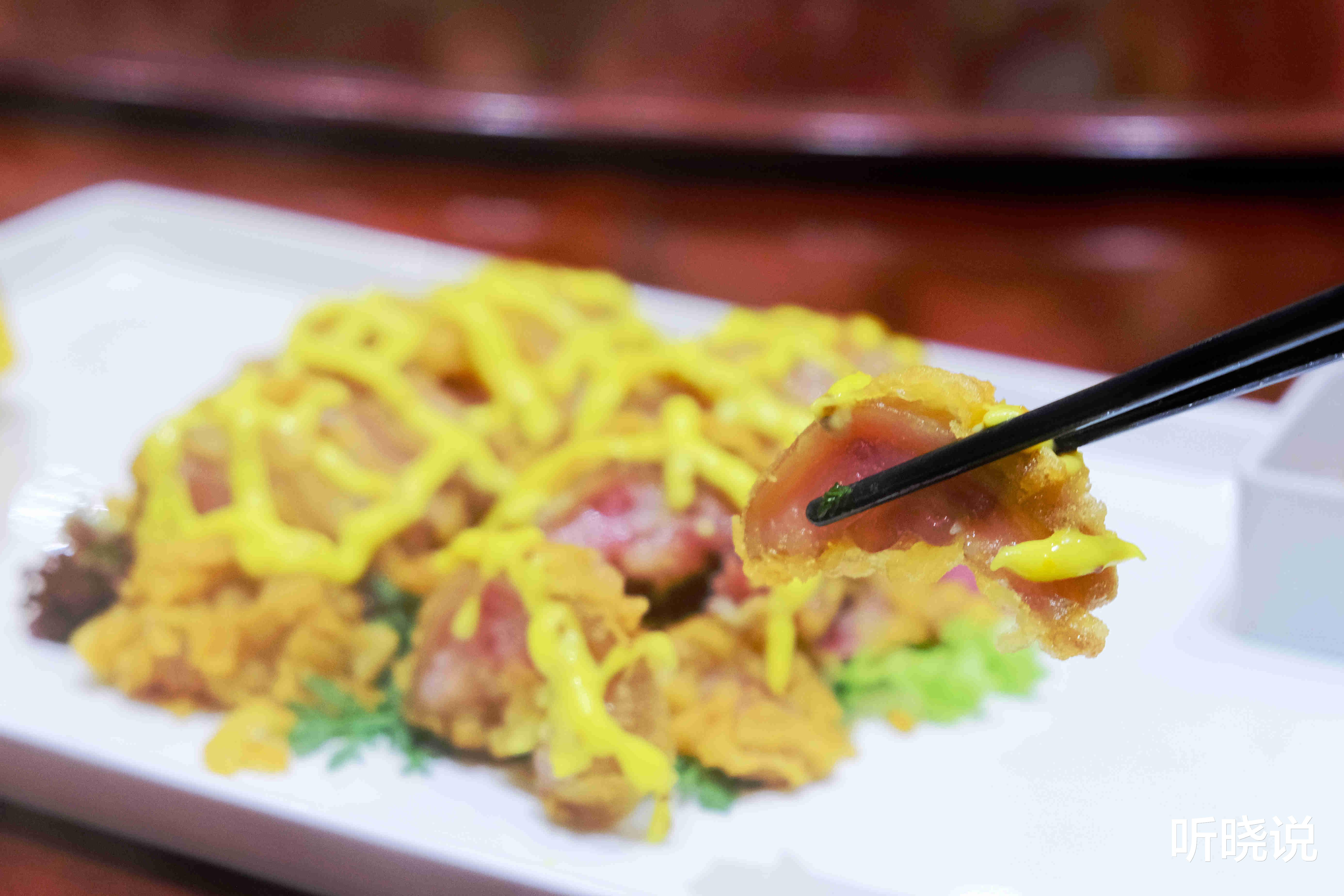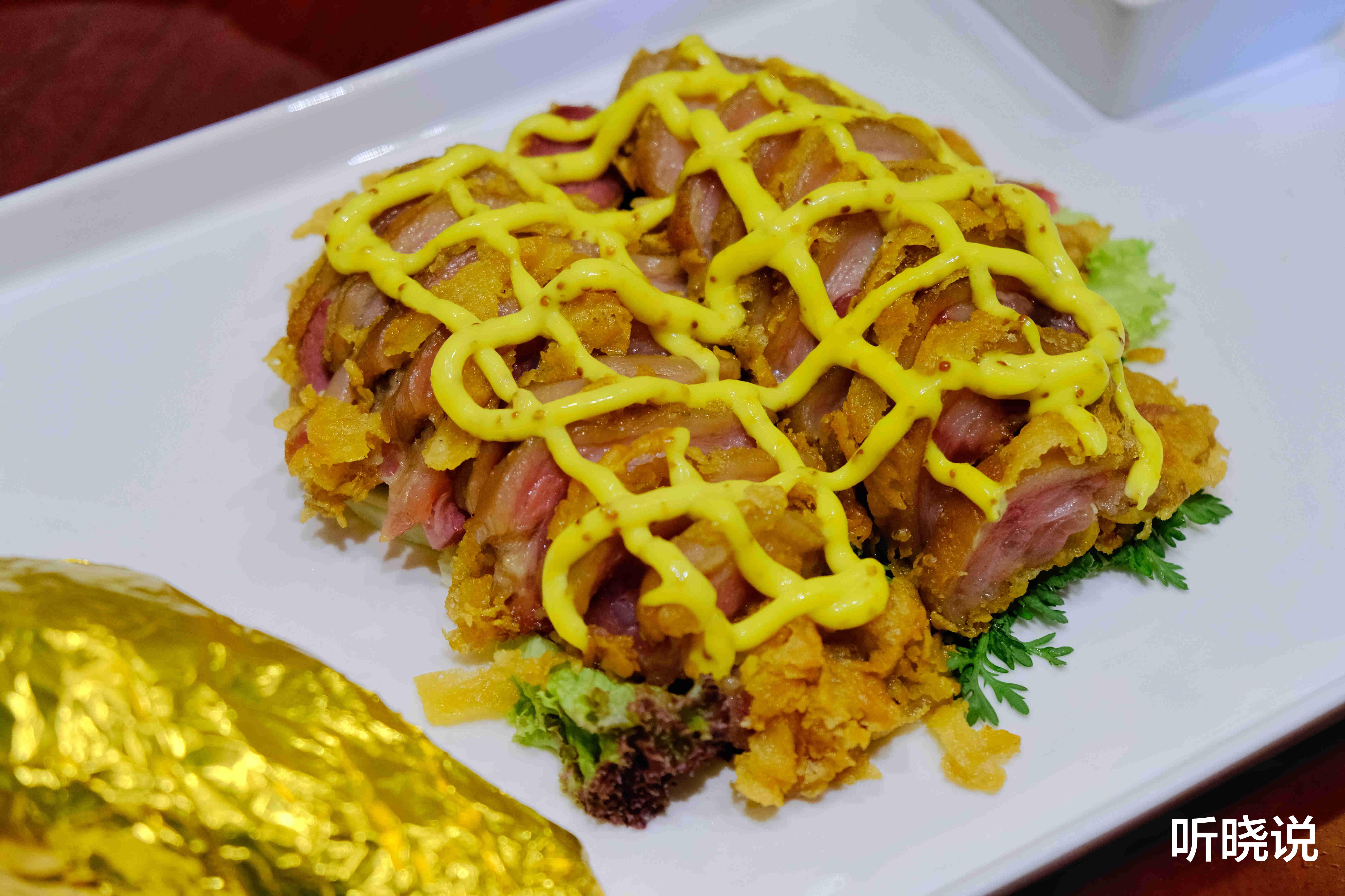黄金脆皮肘子表皮焦脆,里面的肉鲜嫩好吃,有点像德式烤猪蹄,搭配秘制的酱料好吃不腻。