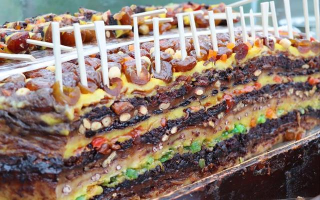 切糕,也被称为玛仁糖,是一种源自新疆维吾尔族的传统食品。它是用核桃仁、玉米饴、葡萄干、葡萄汁、芝麻、玫瑰花、巴丹杏、枣等原料熬制而成的。切糕具有悠久的历史,早在丝绸之路时期就是重要的食物补给,因其易保存、便于携带和高营养的特点,满足了长途旅行商人的需求。