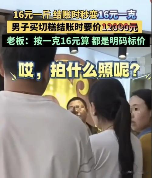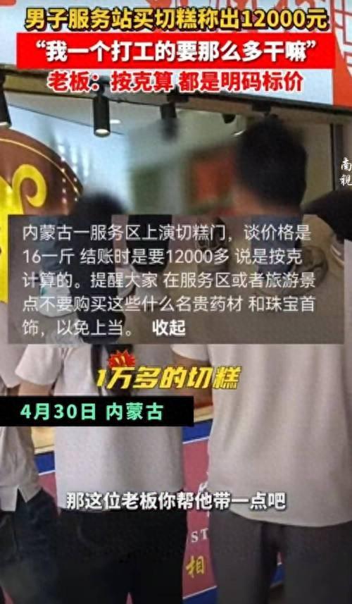 一男子在内蒙古服务区购买切糕时,结账时被告知总价高达12000元人民币。原本男子与商家商定的价格是每斤16元,但结账时商家声称是按克计算,坚称所有商品均按克计价且已明码标价。