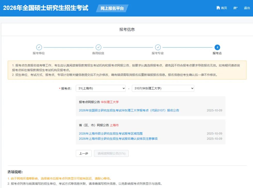 上海市教育考试院指定我校在上海市的报考点为华东理工大学(报名点代码:3107)。研究生报名实行网上缴费,选择本考点的考生均需在网上报名期间完成缴费,网上报名期间未缴费将无法进行确认和考试。