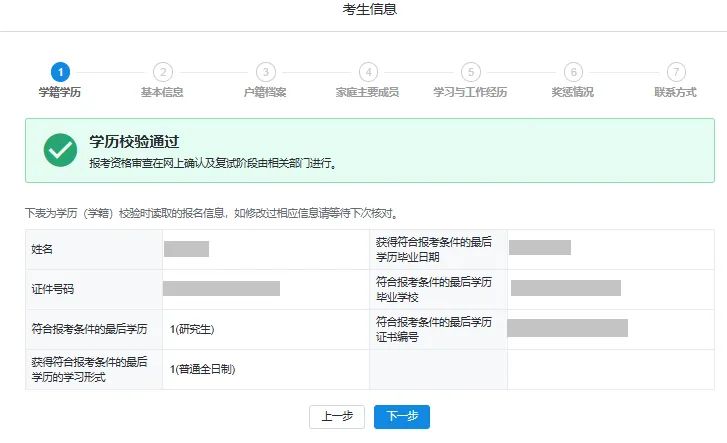 确认注册实名制个人信息。除个人身份证号码之外,内容皆可修改。如身份证号码不对,必须填写正确的身份证号码,重新注册。考生信息共分7部分内容。