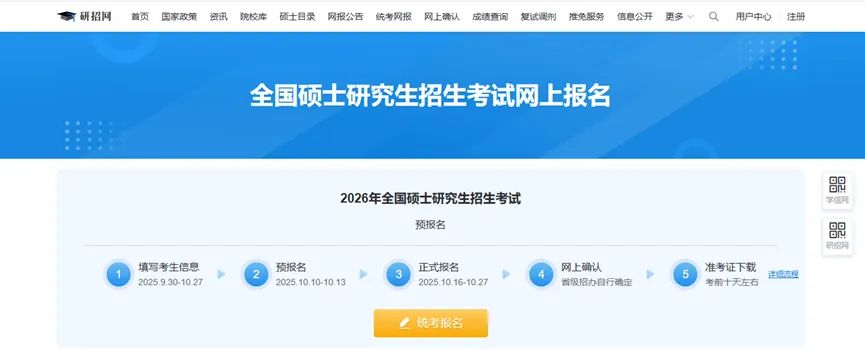 1. 登录“全国硕士研究生招生考试网上报名平台”(https://yz.chsi.com.cn/yzwb/),点击“统考报名”。