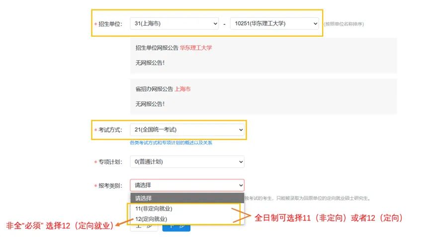 备注:关于“定向就业单位”:定向就业单位一般就是自己目前就业的单位。报考期间就业单位发生变化不会影响考生报考。非全考生按照规定只能选择12(定向),请注意填写,以免耽误后续报考!