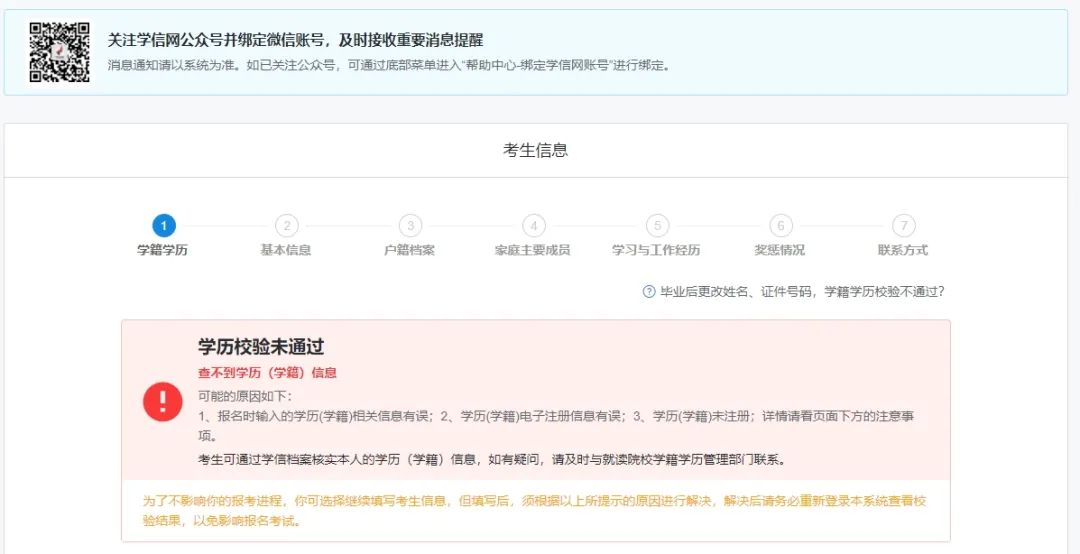 招生单位、考试方式、报考点关键信息不允许修改,若填写错误,只能取消报名信息后,再新增一份新的报名信息。