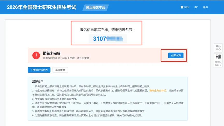 注意:生成报名号,且交费成功后,才算报名成功。报名号是网上确认的重要凭证,请考生务必牢记。