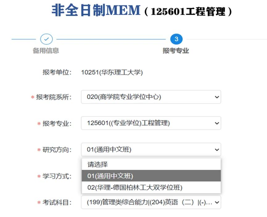 (1) 报考全日制MEM的考生可选择12或11(定向或非定向就业);