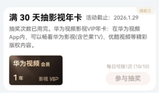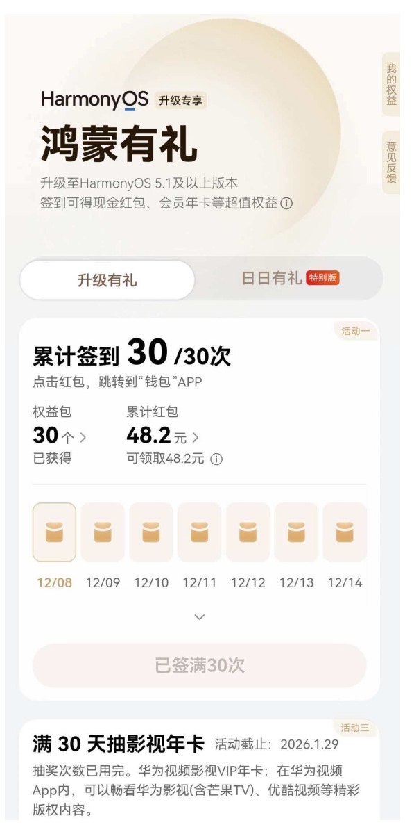 这次的“鸿蒙有礼”满30天抽年卡,对于喜欢追剧追综艺的我来说,简直是把饭喂到了嘴边。必须要按头安利一下:首次签到后的第30个签到日(第30次签到时就行,不需要连续签到,但是活动快结束了,一定要注意活动时间!),就能参与年卡免单券抽奖。
