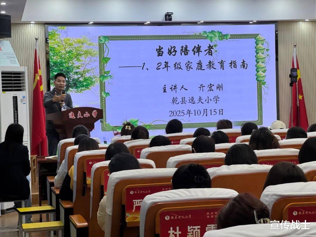 2025年10月15日下午,秋意正浓,乾县逸夫小学内暖意融融。应学校邀请,亓宏刚(一心)老师莅临该校,为该校一、二年级的80多名学生家长代表带来了一场题为《当好陪伴者》的精彩专题讲座。此次活动旨在帮助低年级学生家长树立科学的家庭教育理念,掌握有效的亲子陪伴方法。
