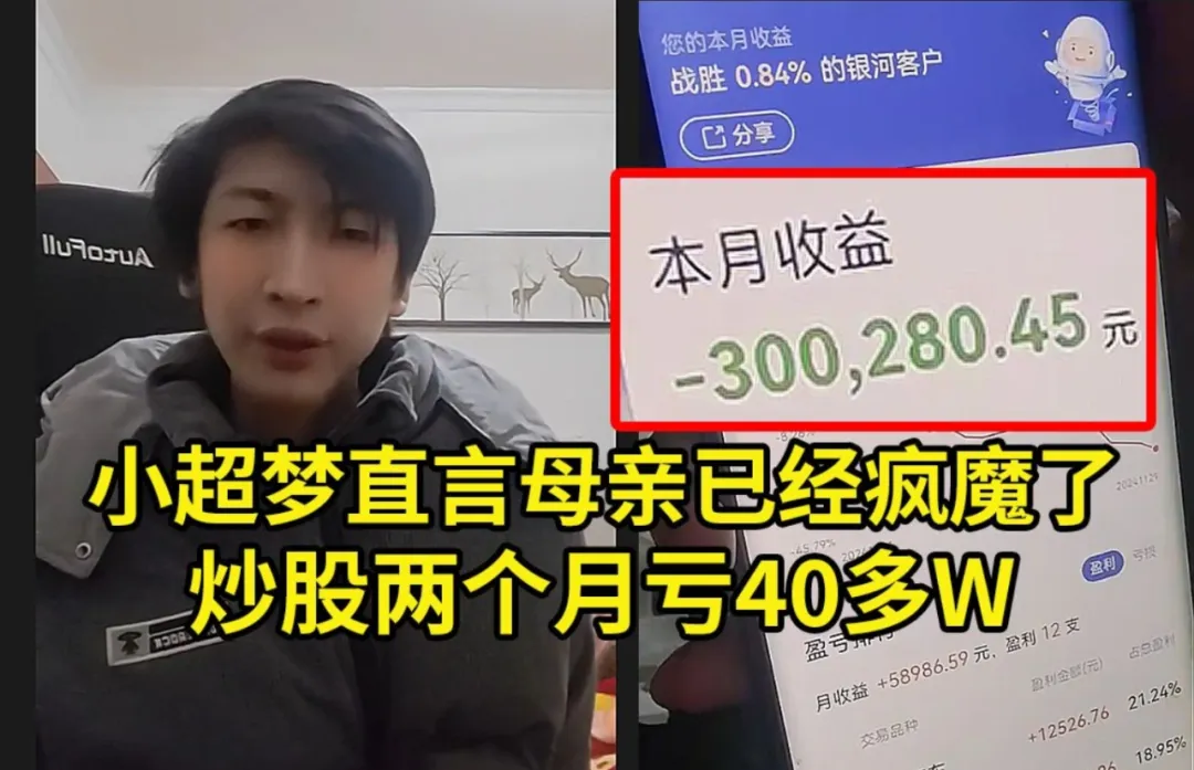 大家都知道像小超梦这种主播,年收入几百万还是轻轻松松的,但是,即使再能赚钱,也架不住自己的母亲沉迷炒股,并表示他妈整个人状态和赌徒一样。谁也劝不了,更恐怖的是还把自己家的房子作了抵押,然后去贷款炒股,前前后后的各种贷款和本金,已经投进去了八十多万,关键两个多月不到亏损了40多万。