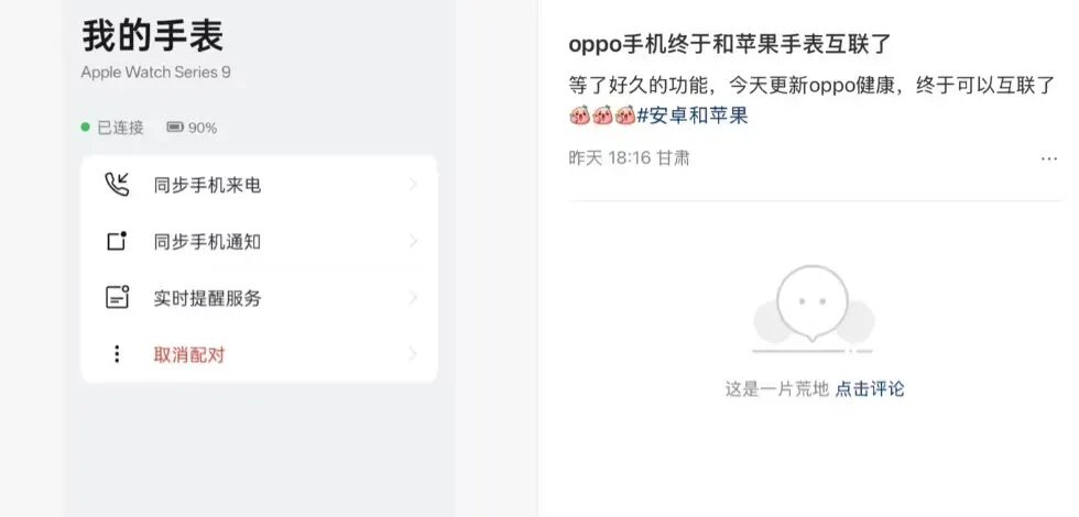 具体操作方面,用户需要将 OPPO 手机端的健康 App 更新至最新版本,之后在 Apple Watch 的 App Store 市场中下载“OPPO 健康互联”App,即可完成手机与手表之间的配对。