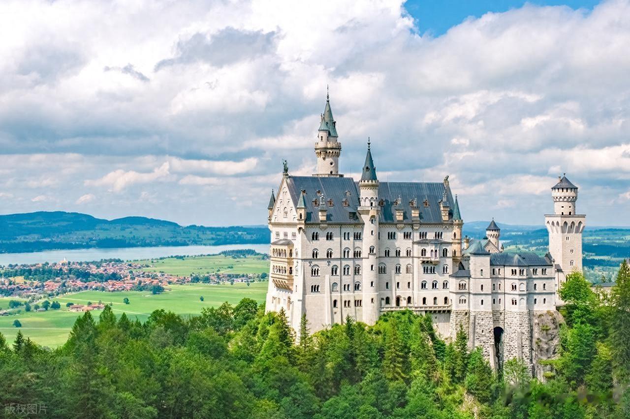 农人过去了;行人便加快脚步沿着树下的路向前走去。过了一刻钟光景,他忽然在左边树荫下站住了,那条路转入一个山坡,坡下百年老橡树的树梢差不多跟山坡一样高。从树梢望过去,前面展开一片宽阔的、当阳的景色。下面低低地躺着一片平静的、深蓝的湖水,湖的四周差不多全让阳光照耀的绿树环绕着;只有在一个地方树木分开了,露出一派远景,可以一直望到远远的一带青山。对面望过去,绿叶丛中笼罩着一片雪似的白色,都是开花的果树,树后在湖畔高高的岸边耸立着庄主的宅子,白墙红瓦,显得格外分明。一只鹳鸟从烟囱上飞起来,在水上慢慢地盘旋飞绕。