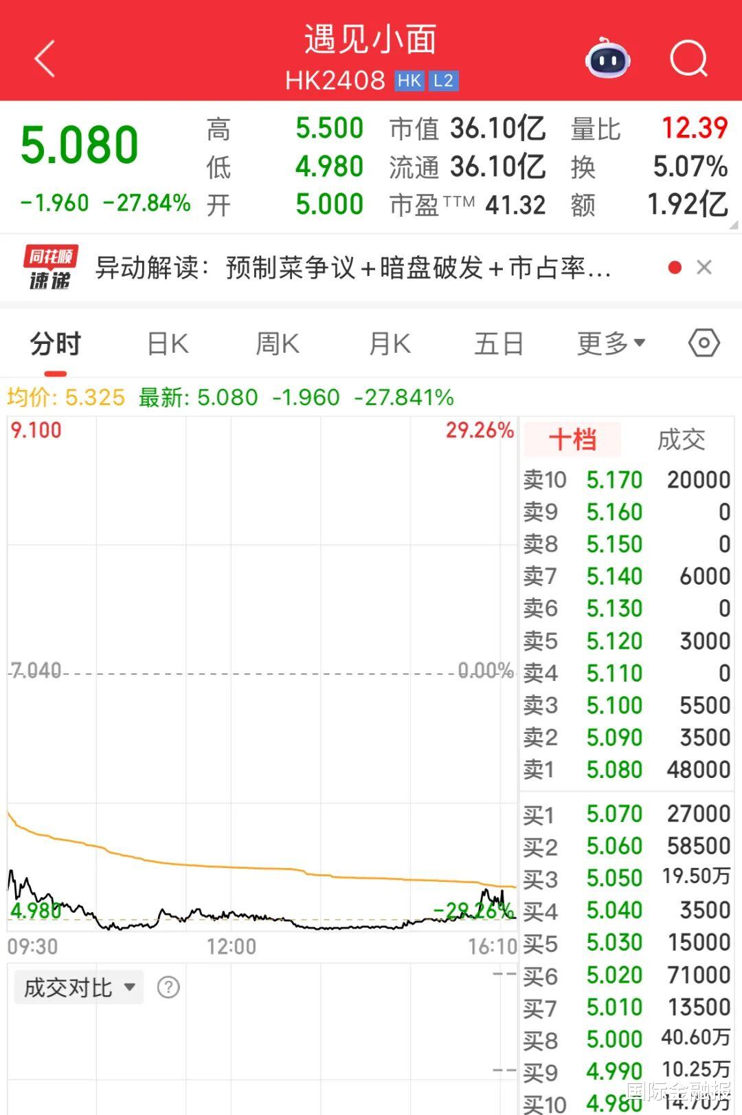遇见小面以5港元/股的价格开盘,较发行价(7.04港元)大跌28.98%,后续股价持续低位震荡,最终报收5.08港元,跌幅收窄至27.84%,对应总市值36.1亿港元。