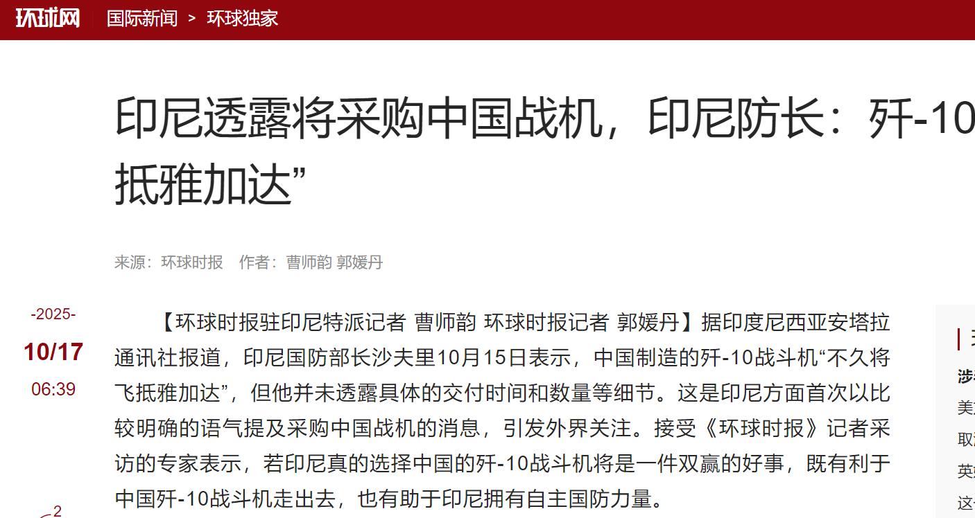 据环球网援引印尼媒体消息报道,印尼防长正式确认,将采购中国歼-10战斗机。