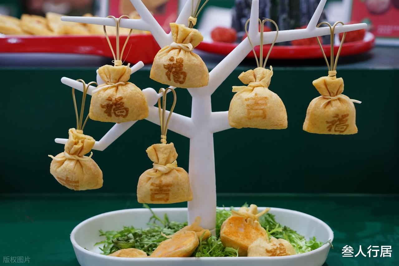 寓意:用豆腐皮包裹四色时蔬,象征福气满满;圆形造型寓意团圆美满。