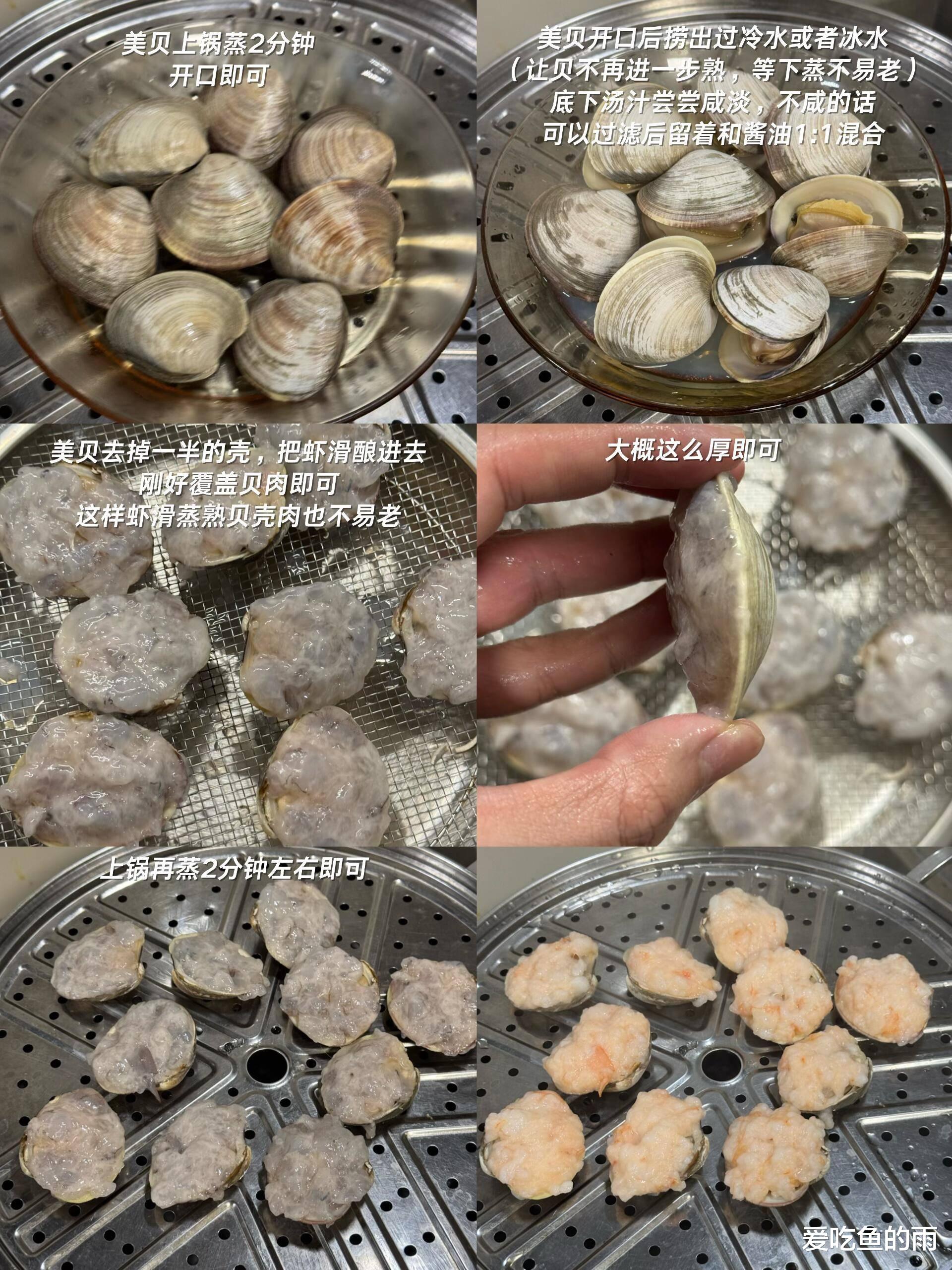 酿馅如盖被,蒸锅就是避风港。冷藏好的虾滑装进裱花袋(或直接用勺),在贝壳“小船”里挤一团粉嘟嘟的虾滑,盖上贝肉当被子。手指蘸水抹平边缘,仿佛给小船封上温柔的蜡。蒸锅水烧到滚沸再放虾滑贝,大火蒸8分钟足矣——掀盖瞬间,鲜气裹着白雾“轰”地扑出,贝肉微蜷如月牙,虾滑胀成粉白小云朵!