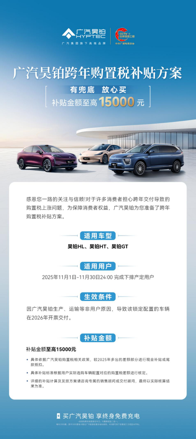 年底是购车旺季,但许多消费者在此时购车都会面临一个顾虑:如果车辆交付跨年后,遇到购置税上涨怎么办?针对这一痛点,在 2025 广州车展全球首秀的广汽昊铂 HL 黑武士版,特别推出了跨年购置税补贴方案,提供至高 15000 元的购置税差额补贴,真正做到 “有兜底,放心买”,让消费者在十一月购车旺季能够毫无顾虑地入手这款豪华新能源座驾。