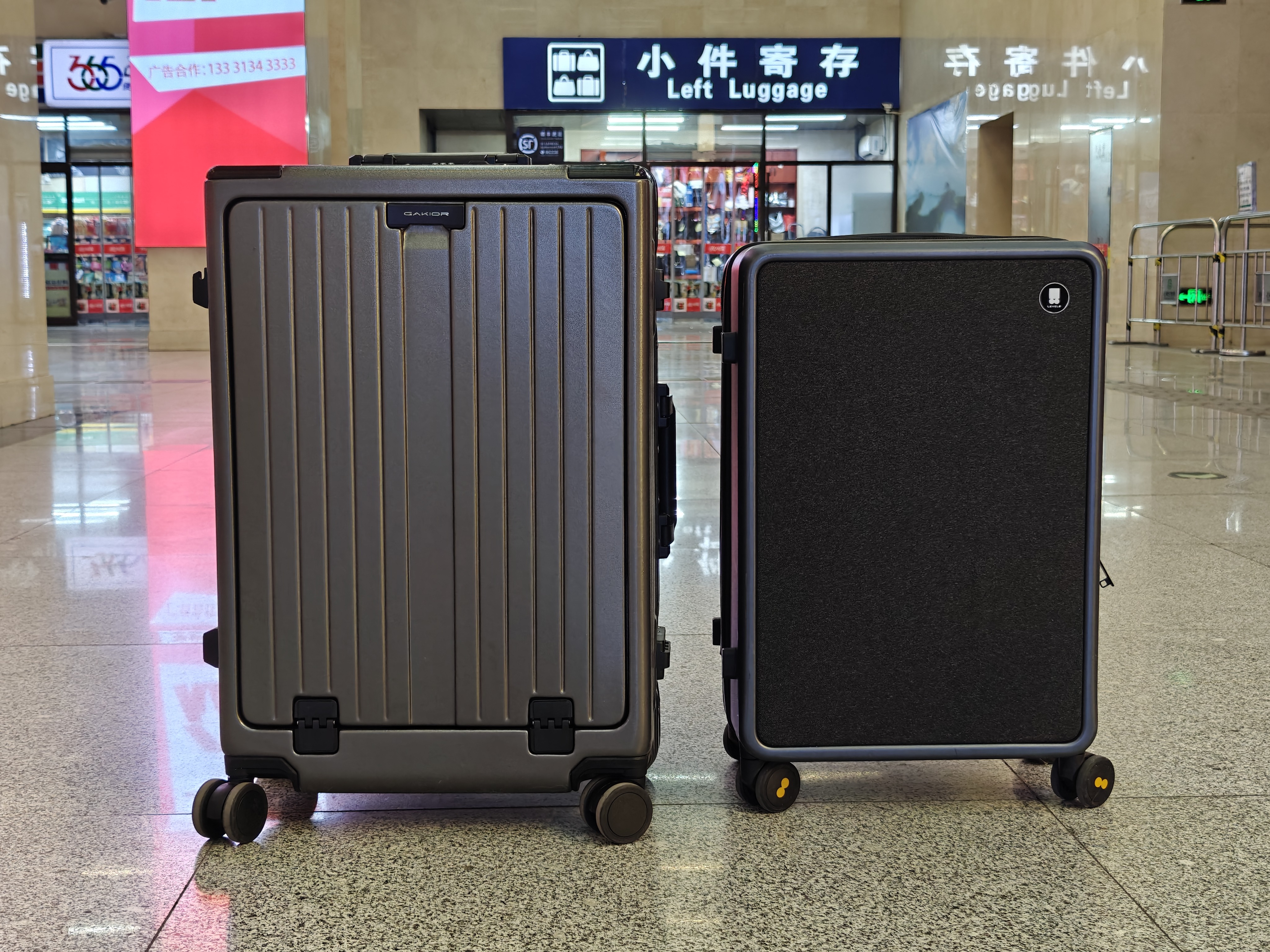 先给纠结尺寸的朋友划个重点:行李箱按“英寸”标注(1英寸≈2.54cm),核心看长宽高之和,不同尺寸对应不同场景——20寸是登机箱(30-40L),适合1-3天短途;24寸(60-80L)长宽高约38×60×28cm,容量刚好装下3-7天衣物+年货礼品,是托运无压力、便携不占地的中长途“黄金尺寸”;26-28寸(80-120L)适合家庭长途,但体积大显笨重;30寸以上则是留学专用,日常用太夸张。下图左侧为GaKior24寸行李箱,右侧为其他品牌20寸行李箱。
