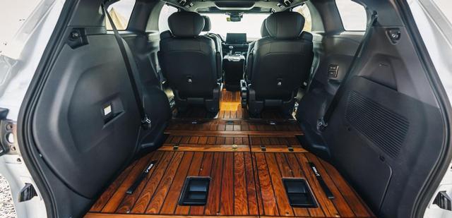 第三排座椅收纳后,可以形成纯平的大后备箱空间,最大进深达到了1700mm,第三排折叠后的后备箱容积达到了2112L,能放更多的大行李。即便是第三排满员的情况下,常规容积也达到了525L。而同级中的腾势D9只有410L,优势一目了然。全车还具备19个杯架等超多储物空间,实用性极高。