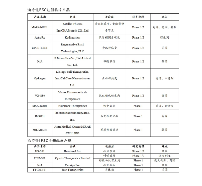 从治疗的疾病种类来看,iPSC与ESC的注册临床试验涉及多种适应症,包括I型糖尿病、黄斑变性、帕金森病、脊髓损伤等。9款治疗性ESC注册性临床产品中,眼科疾病(33%)以及神经系统疾病(45%)为主要的研究领域,另外也有针对内分泌系统(11%)以及泌尿系统(11%)的治疗性研究。4款治疗性iPSC注册性临床产品中,心血管疾病(40%)占较大的比例。